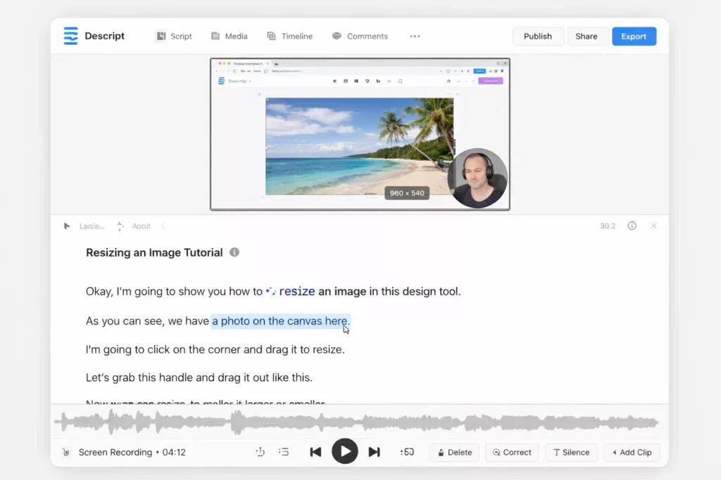 Descript’s AI capabilities aren't limited to audio and text; they also extend to visual enhancements.